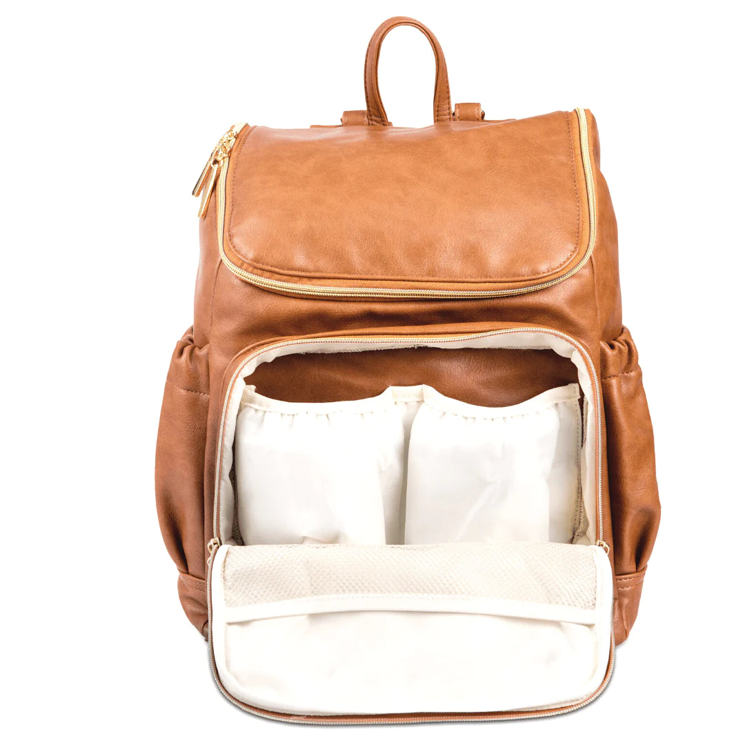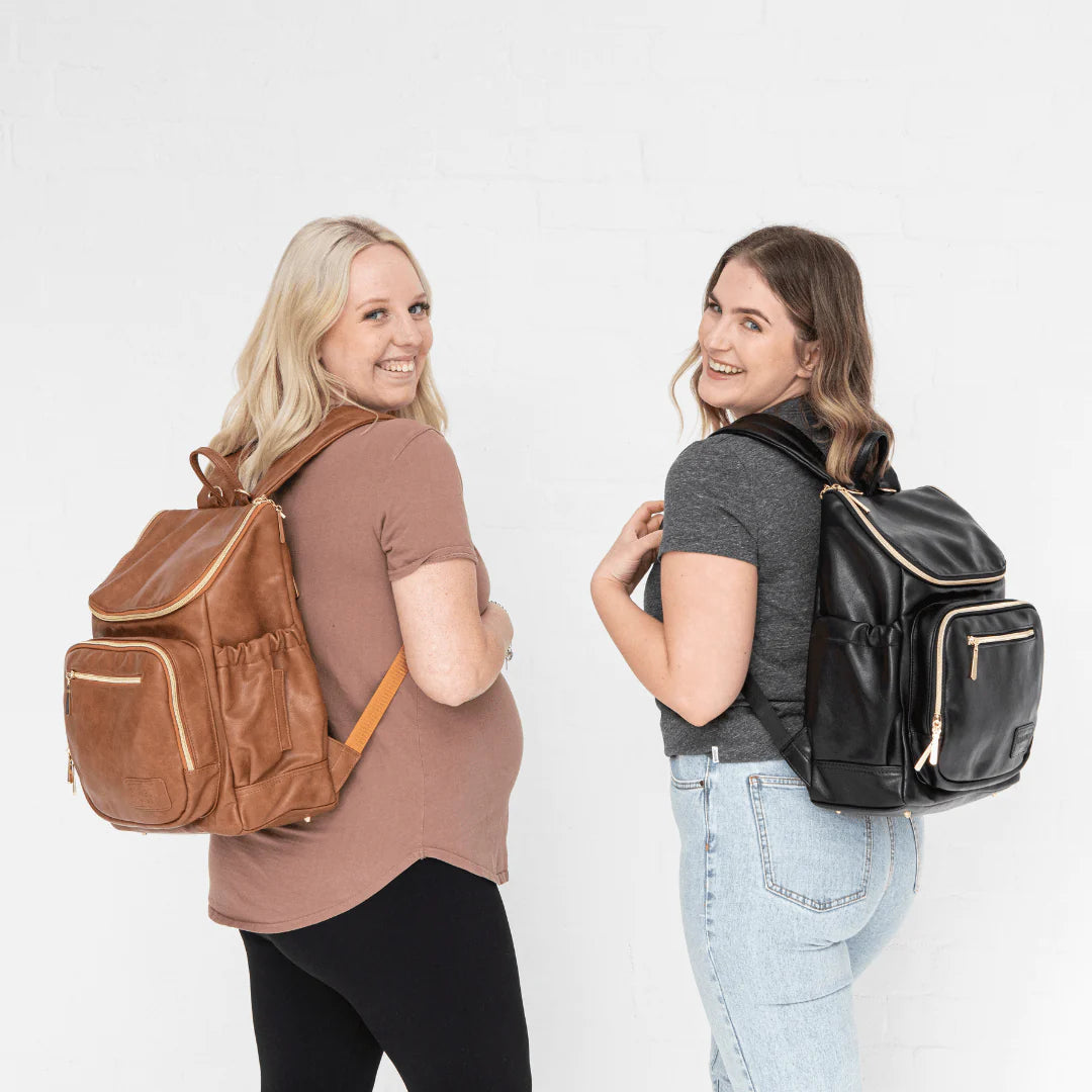 The Florence nappy bag backpack is the classic stylish baby that goes with everything. But she is so much more than just a pretty face featuring oodles of space, organised compartments and pockets and stunning gold hardware. Get ready to fall in love with this beautiful nappy bag and never look back. Available in dreamy tan or classic black you simply can't go wrong with this must have.