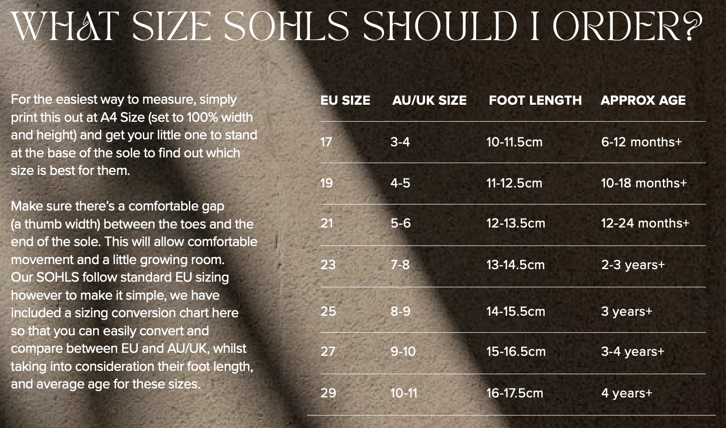 Our SOHLS are designed to include a little extra ‘wriggle room’ and with our knit fabrics that moulds to the foot. If your child measures at the beginning of a SOHLS size, they’ll have around 1.5cm of space between their foot and the end of the shoe. We recommend 0.5-1.5cm of wriggle room. Your child’s toes should never be touching the end of the shoe.